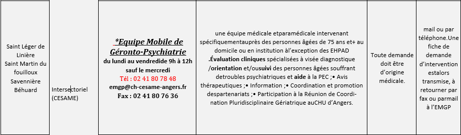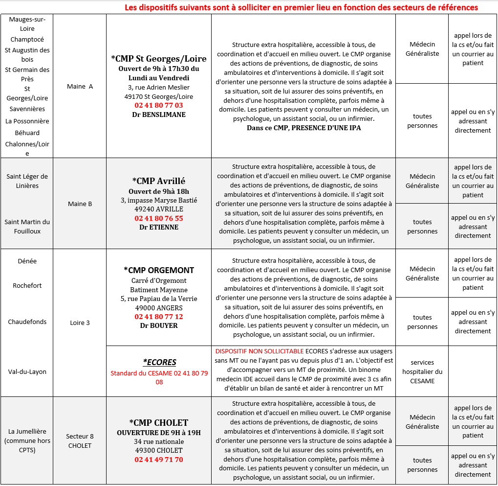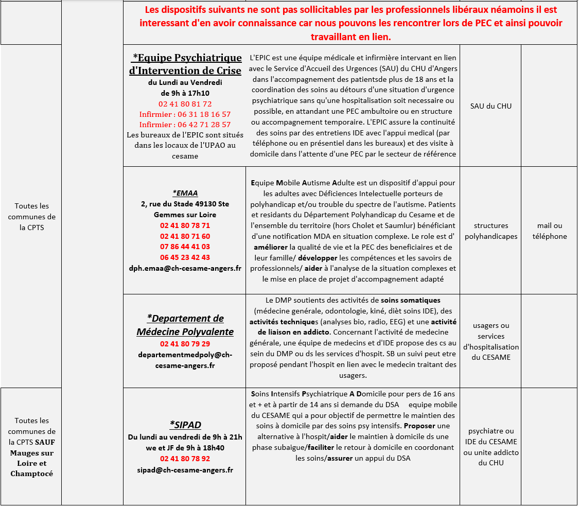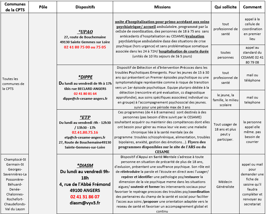 Toutes les communes de la CPTS | INTERSECTORIEL (CESAME) | *Cellule de Coordination Du lundi au vendredi 8h30 à 20h10 WE et JF de 11h à 18h40 | coordonner et conseiller sur le parcours de soins du patient/conseils thérapeutiques/permanence téléphonique permettant de joindre un IDE ou un psychiatre afin de répondre aux questions que se posent les partenaires de soin, les usagers et les familles/évaluation médicale (delais de quelques jours) selon les besoins, en présentiel ou par téléphone | Médecin Généraliste | appel |